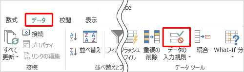 2.リボンから「データ」タブをクリックし、「データツール」グループの「データの入力規則」のアイコン部分をクリックします。