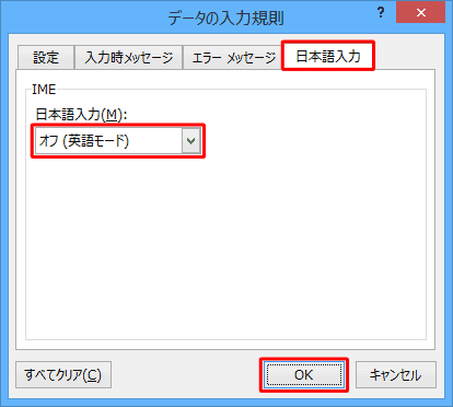 ※ 半角の英数字のみ入力するセルには、「オフ(英語モード)」または「半角英数字」を選択します。