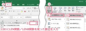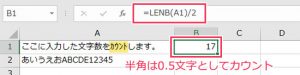 B1に「=LENB(A1)/2」と入力します。