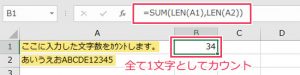 B1に「=SUM(LEN(A1),LEN(A2))」と入力します。