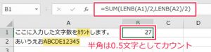 ・半角は0.5文字、全角は1文字とし、A1の文字数をB1でカウントする。