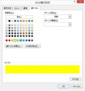 「塗りつぶし」タブをクリックし、背景色に黄色を選択します。「OK」をクリックして全てのダイアログを閉じます。