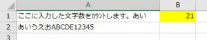 こうすると、A1に21文字以上入力した場合、B1の背景色が黄色になります。