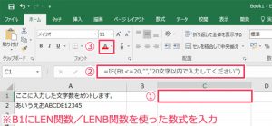 C1に「=IF(B1<=20,””,”20文字以内で入力してください”)」と入力⇒「フォントの色」を「赤」に変更します。