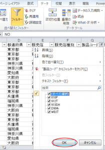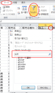再度、操作対象フィールドのフィルターボタンをクリックすると、[製品コード]の[912T]と[W53T]が抽出されているのが分かります。フィルター抽出を解除して元のデータ一覧に戻すには、[すべて選択]をクリックします。■になっている箇所をクリックします。