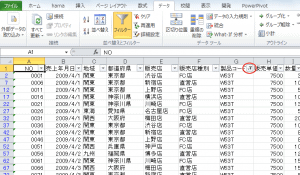 データ内のセルをクリックして、[データ]タブにある[並べ替えとフィルター]グループの[フィルター]をクリックします。データの各フィールドにオートフィルターが設定されます。各列の見出しに▼が表示されます。▼ボタンをクリックします。