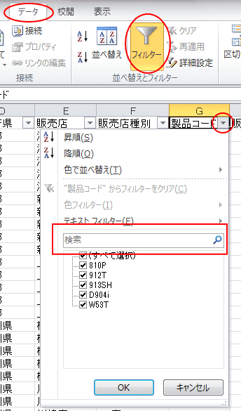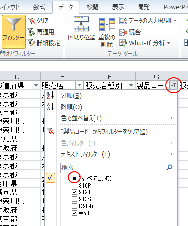 再度、操作対象フィールドのフィルターボタンをクリックすると、[製品コード]の[912T]と[W53T]が抽出されているのが分かります。フィルター抽出を解除して元のデータ一覧に戻すには、[すべて選択]をクリックします。■になっている箇所をクリックします。