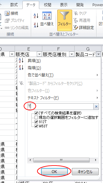 たとえば、[テキストフィルター]に[T]の字を入力したら、[T]を含む[製品コード]が抽出されます。抽出したいデータが目的のものであれば、このまま[OK]ボタンをクリックすると、Tを含む[製品コード]のレコードが抽出されます。