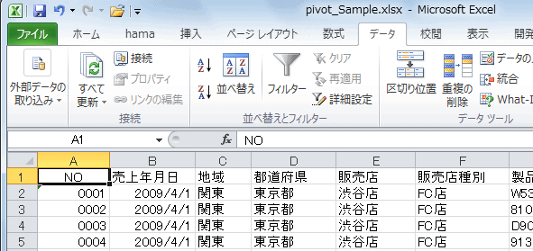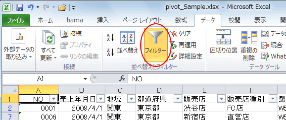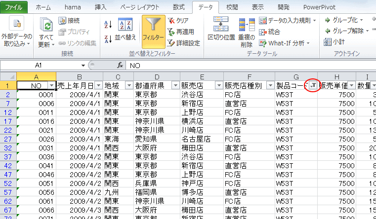 データ内のセルをクリックして、[データ]タブにある[並べ替えとフィルター]グループの[フィルター]をクリックします。データの各フィールドにオートフィルターが設定されます。各列の見出しに▼が表示されます。▼ボタンをクリックします。