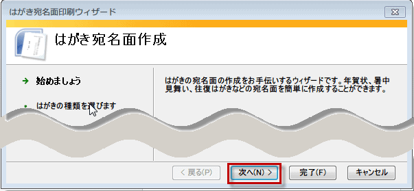 はがき宛名面作成ウィザードが起動しますので、次へをクリックします。