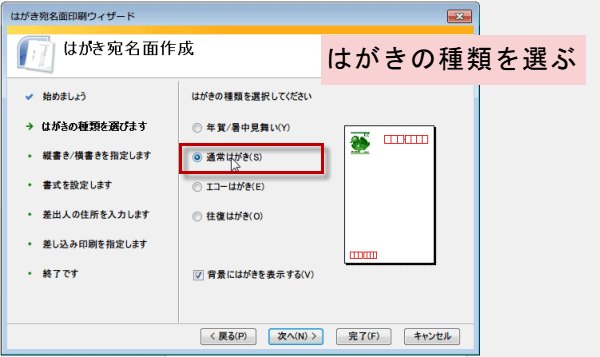 はがきの種類では利用するはがきのタイプを選びます。例では通常はがきを選択しています。