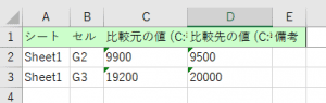 比較をクリックすると違う部分のセルに色が付き、さらに比較されたセルの詳細が表示されます。