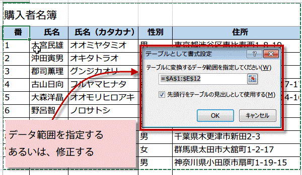 テーブルとして書式設定ダイアログボックスが表示されるので、表の範囲を指定します。例ではExcelはデータの入力されているセル範囲を自動で選択してますが、その範囲が広いので、修正することにします。