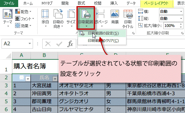 2.テーブルを選択して印刷範囲を設定