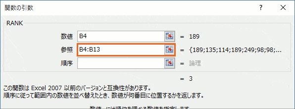 現在関数を入力しているC4番地は、阿部さんの販売個数が何位なのかを、みんなと比べて表示させたいわけですから、その阿部さんの販売個数が入力されているB4番地を指定する、というわけです。