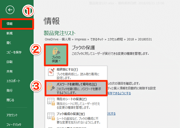 [ファイル]→[情報]→[ブックの保護]と覚えておけば、自分がパスワードを設定するときに戸惑うことはなくなるはずです。