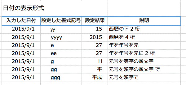 日付の書式記号を使い平成などの和暦で表示