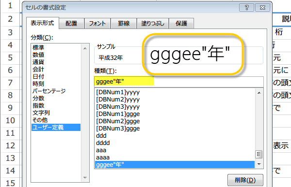 たとえば、一般的な西暦表示の日付「2020/7/24」を平成32年というような和暦の表示にするには、 セルの書式の表示形式タブをクリックし、ユーザー定義を選択します。 種類にgggee”年”と入力します。