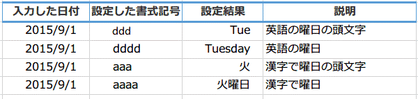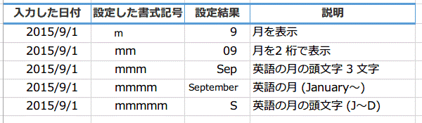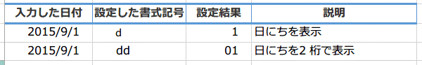 日付の表示形式に使う書式記号