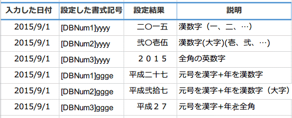 漢数字を表示する書式記号[DBNum]を合わせて使うと、 日付を漢数字で表示することができます。