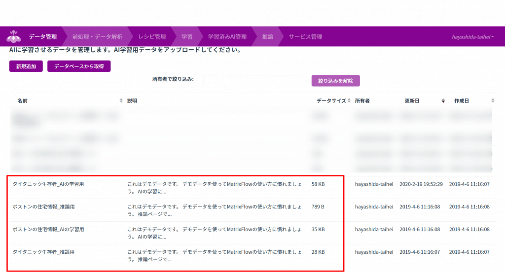 「学習用」と「推論用」と用意されておりまして、通常、機械学習でテストする際は、こちらで用意されているデータのように、学習用のデータでAIのモデルを構築し、その後、推論用のデータで検証して、精度を確認するという手法がとられます。