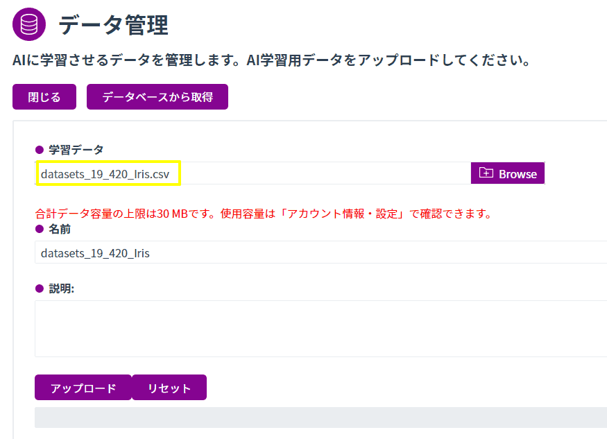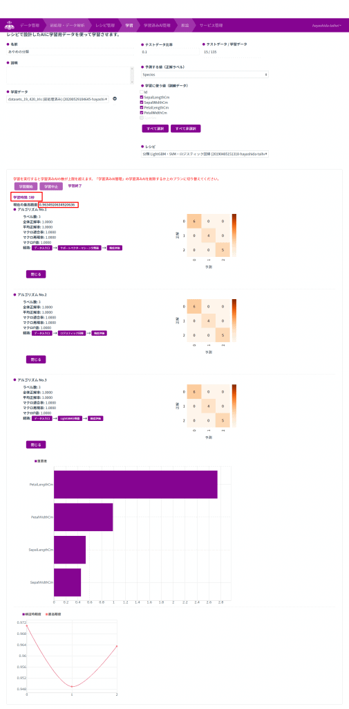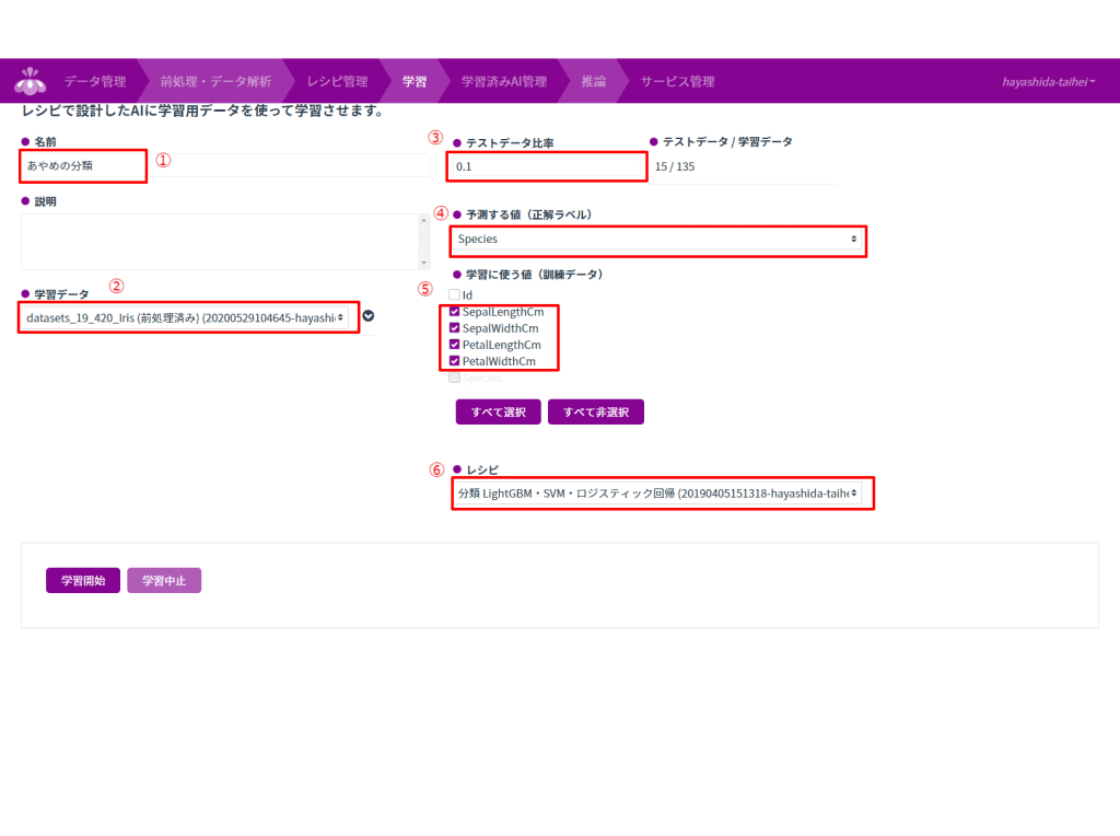 - 学習の名前を入力します。今回は「あやめの分類」としてます。
