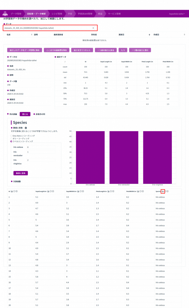 - 予測する値(正解ラベル)を選択します。今回は、あやめの分類を行うので、「Species」を選択します。