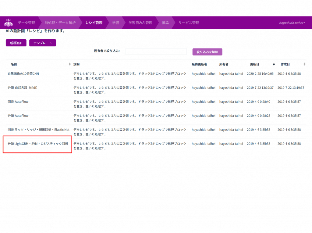 - レシピを選択します。「STEP5」にあるレシピを選択します。今回は、STEP5で説明した通り「分類LightGBM・SVM・ロジスティック回帰」を使用していきます。
