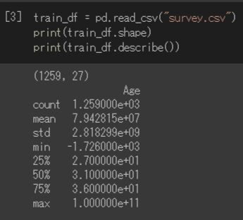 (1259, 27)となっていて、行が1259行、列が27列あり、こちらが意味するところは、1259レコードのデータがあって、分析対象の項目が27個あるということになります。