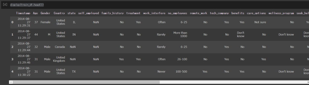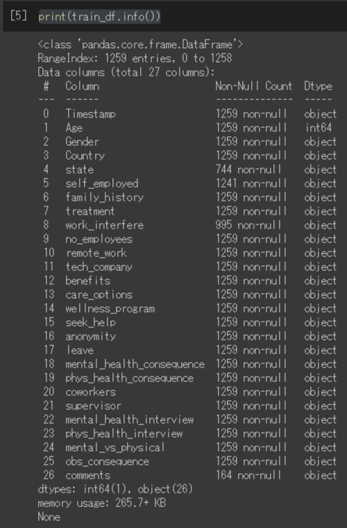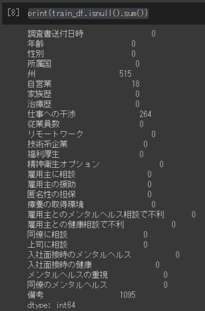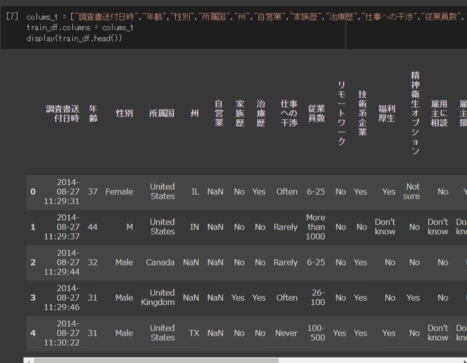 colums_t = ["調査書送付日時","年齢","性別","所属国","州","自営業","家族歴","治療歴","仕事への干渉","従業員数","リモートワーク","技術系企業","福利厚生","精神衛生オプション","雇用主に相談","雇用主の援助","匿名性の担保","療養の取得環境","雇用主とのメンタルヘルス相談で不利","雇用主との健康相談で不利","同僚に相談","上司に相談","入社面接時のメンタルヘルス","入社面接時の健康","メンタルヘルスの重視","同僚のメンタルヘルス","備考"]