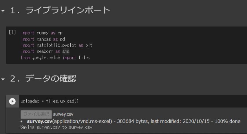 上記を実行するとファイルを選択できるので、ダウンロードしたCSVを選択すると、下図のようになり、データをGoogle Colaboratory上にアップロードできます。