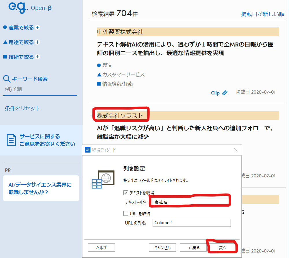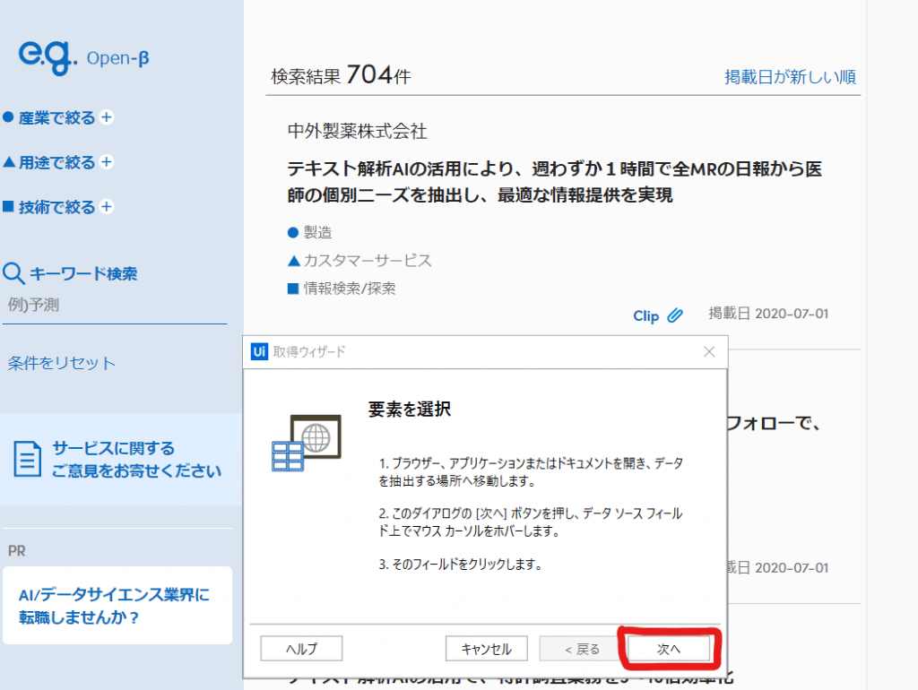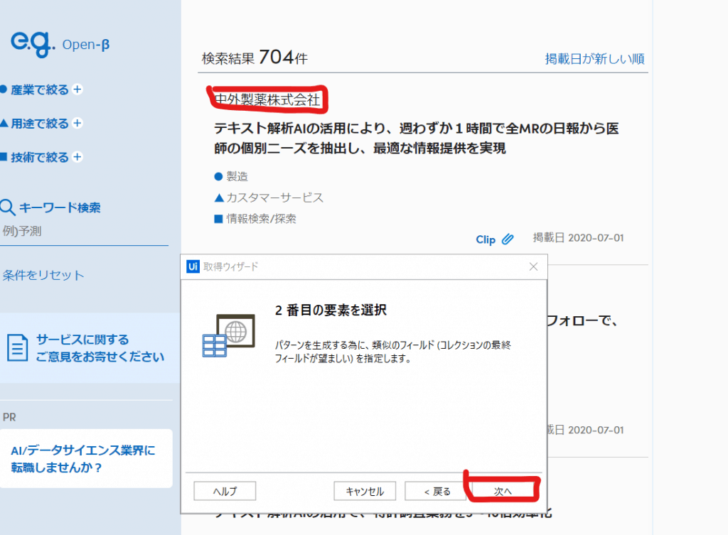 クリック後にサイトのなんでもいいのですが、例えば上図のように会社名を選択すると、2番目の要素を聞かれますので、次へをクリック