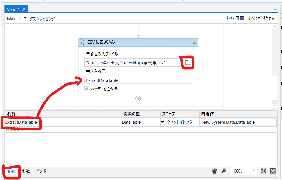 あとは、ファイルの保存先とファイル名を指定してあげて、先ほどSTEP1で勝手にできたテーブルの変数を書き込み元に入れれば完成!