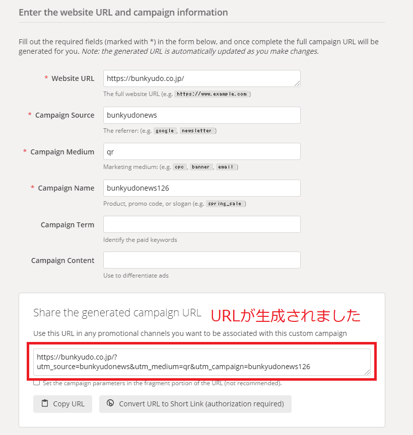必須項目の入力を終えると下の方にURLが生成されています。