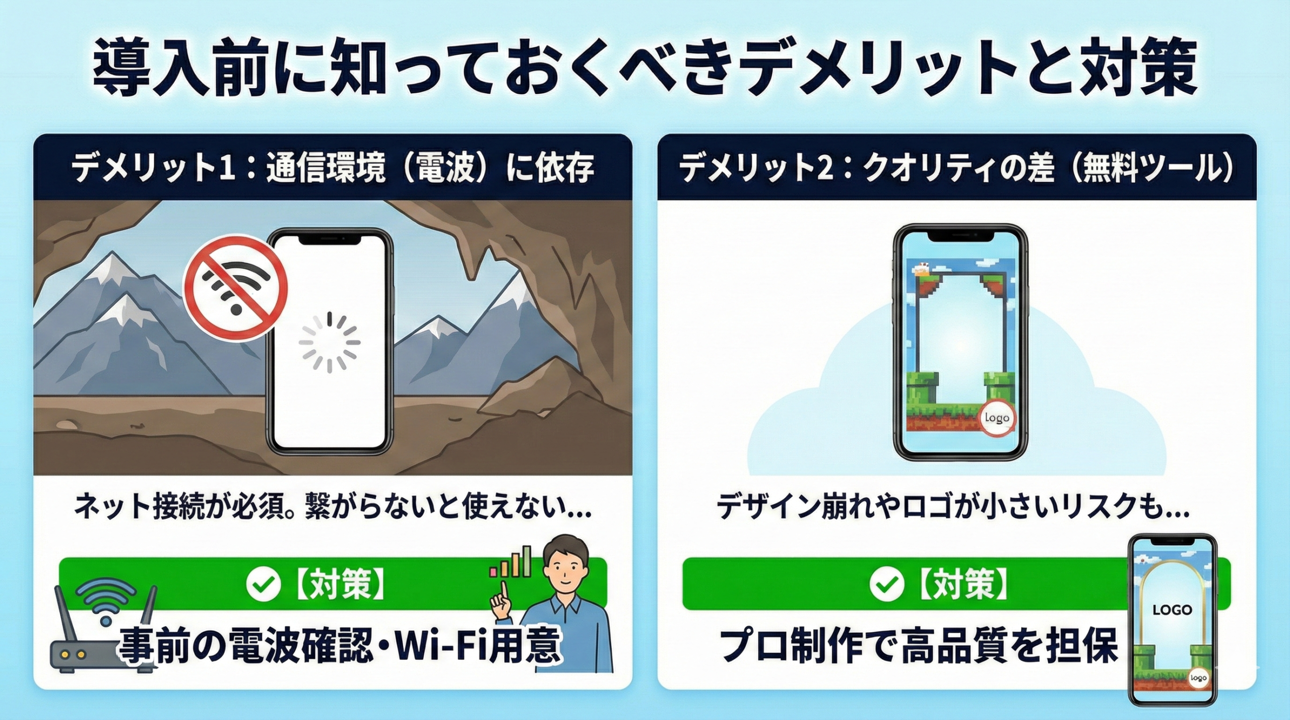 ARフォトフレームは、多くの場合、Webブラウザを使用するため、画像処理やエフェクトの適用にインターネット接続を必要とします。そのため、 山間部の観光地や、イベント会場や設置場所の電波状況が悪いと、ARエフェクトの表示に時間がかかったり、最悪の場合、AR機能が利用できなくなる可能性があります。