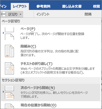 2. [レイアウト]、[区切り]、[次のページから開始] の順にクリックします。