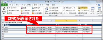 個別のセルに含まれた内容なら数式バーで確認できますが、表全体で使われている数式を俯瞰してチェックしたい場合は、「数式」タブの「数式の表示」を利用します。この機能を利用することで、計算結果の代わりに数式や関数自体を表示することができます。そのまま印刷すれば、数式そのものをプリントすることも可能です。