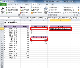 ここでは、各クラスの平均点を計算式やスペースを入れて表示してみましょう。