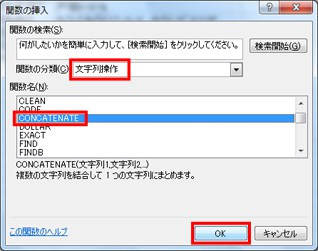 [関数の分類]で「文字列操作」を選択し、[関数名]で「CONCATENATE」を選択して、[OK]ボタンをクリックします。