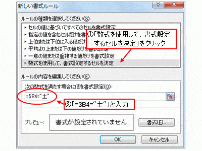 「数式を使用して、書式設定するセルを決定」をクリックして、「次の数式を満たす場合に値を書式設定」の下のボックスに「=$B4=” 土”」と入力します。