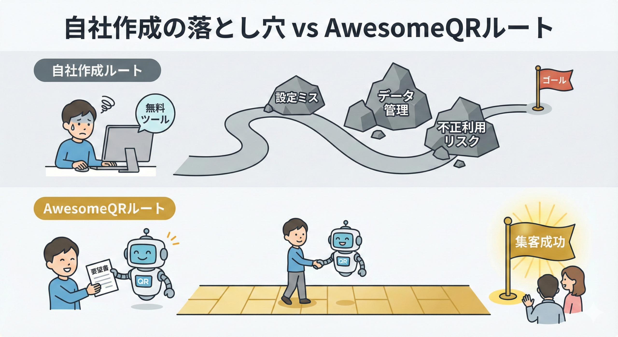 「まずは無料で」と、QRコード作成サイトで画像データを作るケースがあります。しかし、これは単に「画像を表示するだけ」の仕組みです。 「1人1回限り」といった回数制限ができず、何度も使われてしまったり、「誰がいつ使ったか」というデータも取れません。ビジネスで本格的に活用するには機能不足になりがちです。