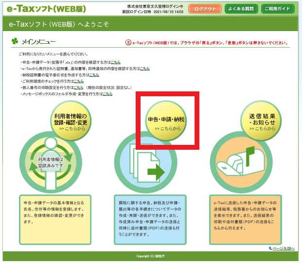 e-Taxとは、国税に関する各種手続きをWEB上で行なえる電子納税システムです。納税期間や金額を申告後、納付する流れになります。詳しくは国税庁のサイトをご覧ください。