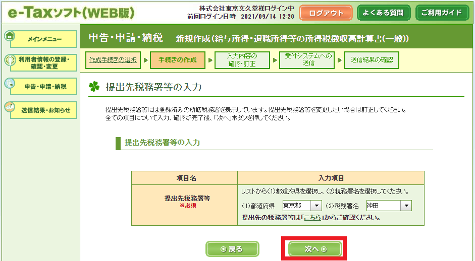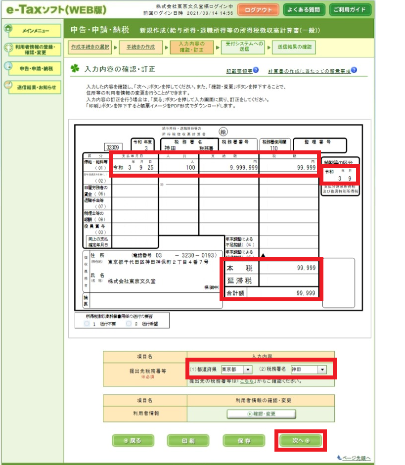 ⑪入力項目を確認のうえ、「次へ」をクリック