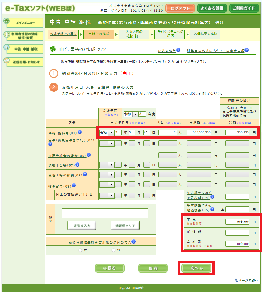 ⑤「納税期の区分」を入力(源泉徴収の対象となる所得を支払った月の翌月10日が期限)