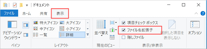 デスクトップよりマイドキュメントなどを起動し「表示」→「ファイル名拡張子」 をチェックします。