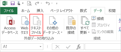 外部データの取り込みでCSVファイルを開く時は、「データ」の「テキストファイル」から行います。