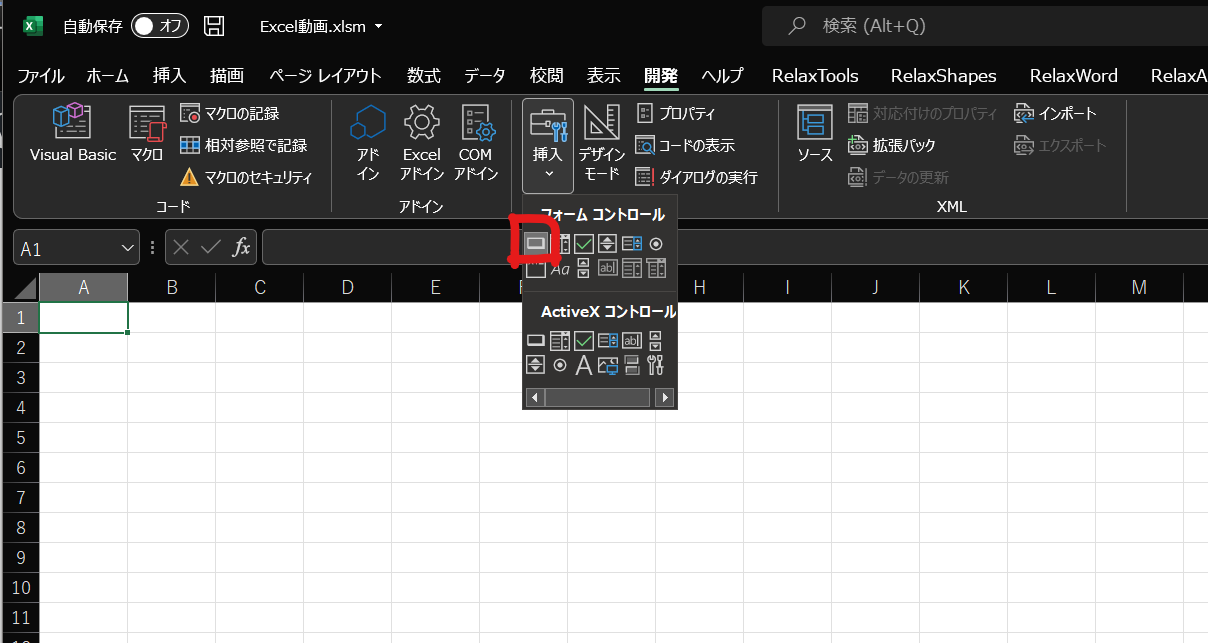 まずは、Excelの開発タブのコントロールリボンから挿入を選択し、ボタンを選択します。