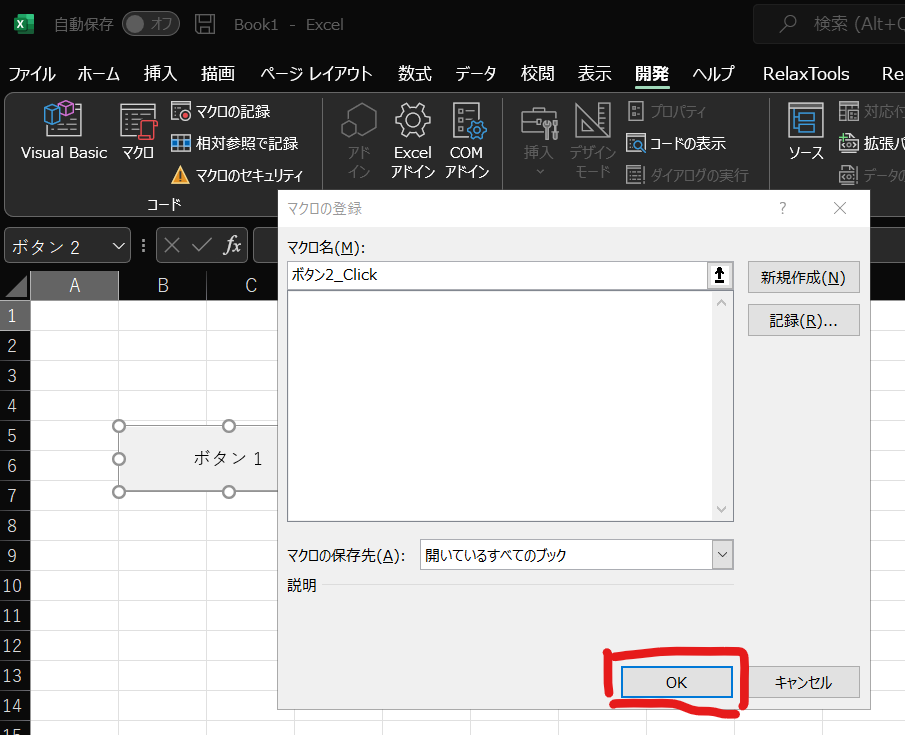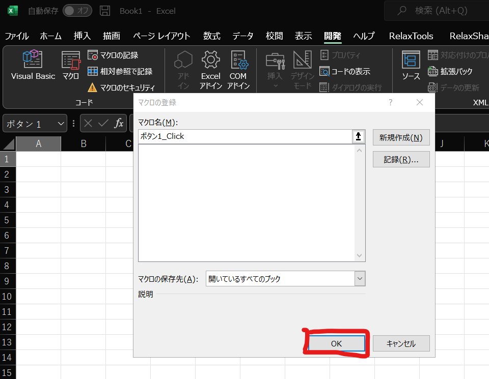 すると、マクロの登録というウィンドウが立ち上がりますので、OKをクリックしていきます。