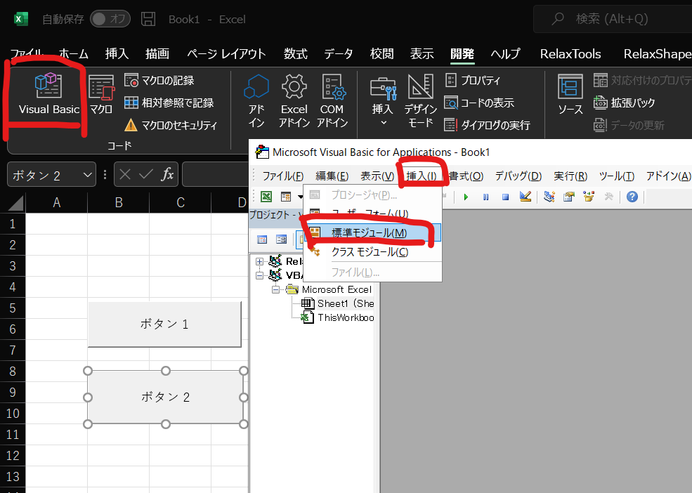 下図のように、開発タブ>コード>Visual Basicをクリックして、挿入>標準モジュールをクリックします。
