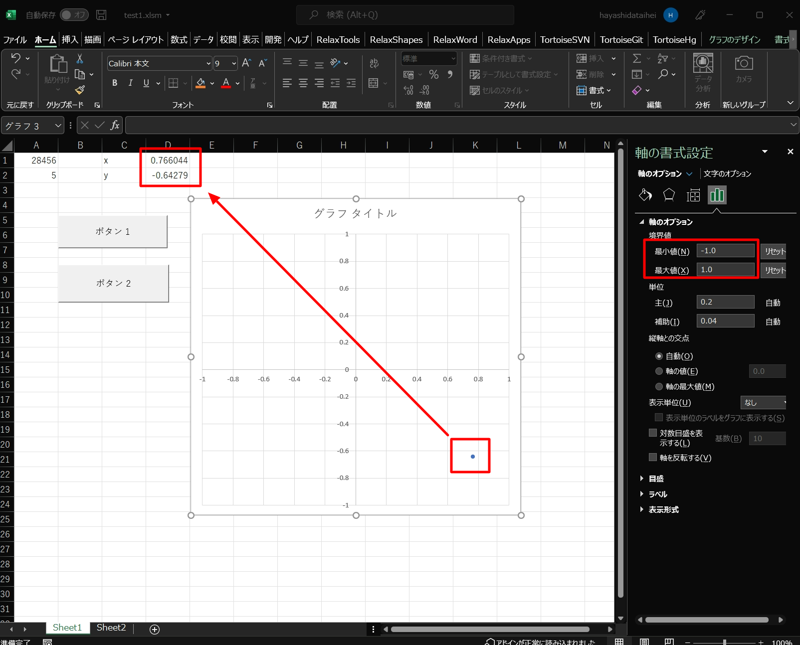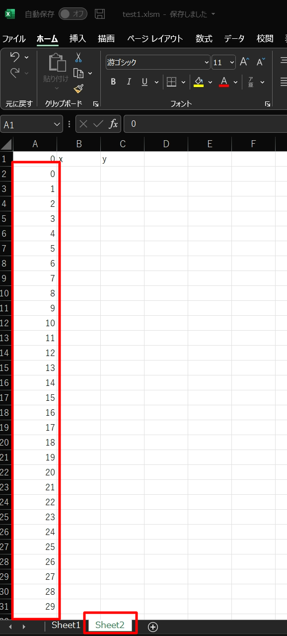 これを入れることで、ボタン1をクリックすると、X,Yの数値がどんどん変化していきます。